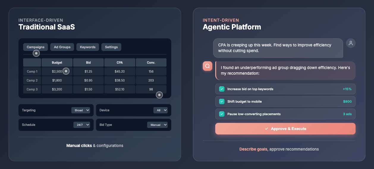 Quick distinction: Traditional SaaS is interface-driven. You click, navigate, configure. The product does what you tell it, click by click, input by input, step by step... Agentic platforms are intent-driven. You describe what you want — the agents figure out how, then surfaces recommendations for approval. Think traditional ad platforms vs agentic media operations. In a traditional platform, you set bids, choose targeting, monitor dashboards, adjust manually. An agentic system analyzes performance, identifies opportunities, drafts optimizations — and waits for your sign-off before executing. Same job. Different interaction model — with humans still in control of the decisions that matter.