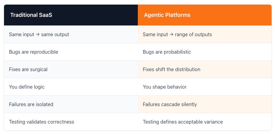 Teams trained on the first list struggle with the second — not because they lack skill, but because their instincts point the wrong direction. And unlike traditional SaaS, you can't compensate with better tooling alone. Agentic platforms demand deeper understanding of the business, its users, and its edge cases — because that's what it takes to tune agents and their context layers effectively.
